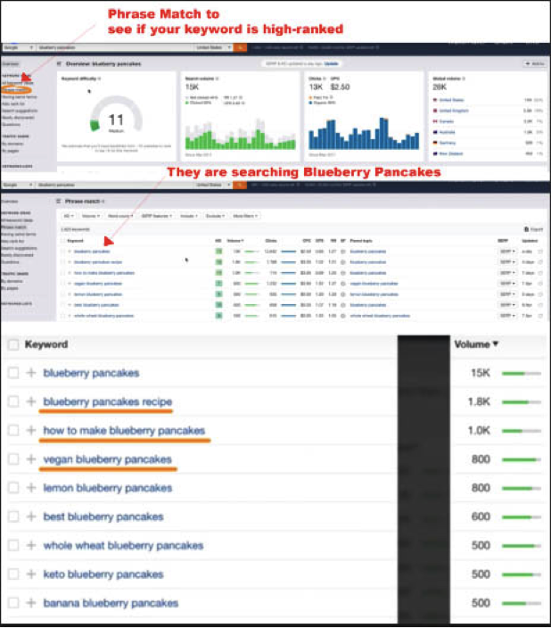 There are also websites that help bloggers identify popular keywords used most frequently for a given topic. One such website, Ahrefs, offers phrase match to help identify top-search keyword terms to formulate your topic. In this example, they’ve used blueberry pancakes to illustrate search volume results.