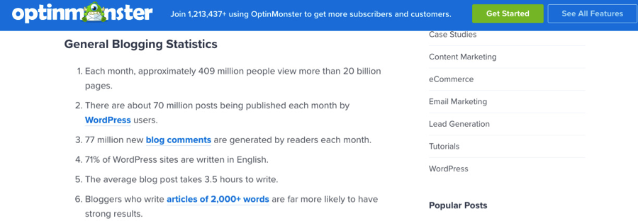 In this example from optinmonster, they offer loads of statistical information with cited articles that you can pull out for your blog post.