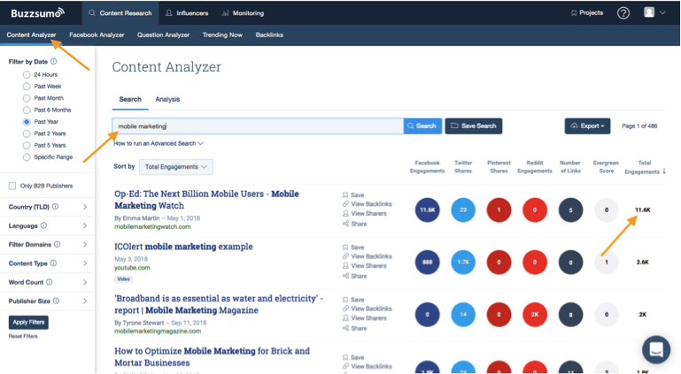 Buzzsumo is another great website that can assist in searching for topic ideas. Their cloud-based platform uses your keywords to generate articles with the highest engagement rate.