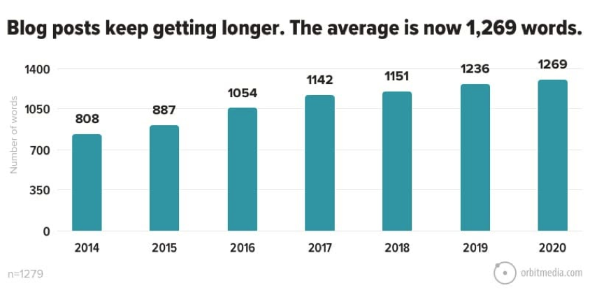 According to Orbitmedia, the typical blog post could be up to 1269 words, which is a huge 57% increase since 2014.