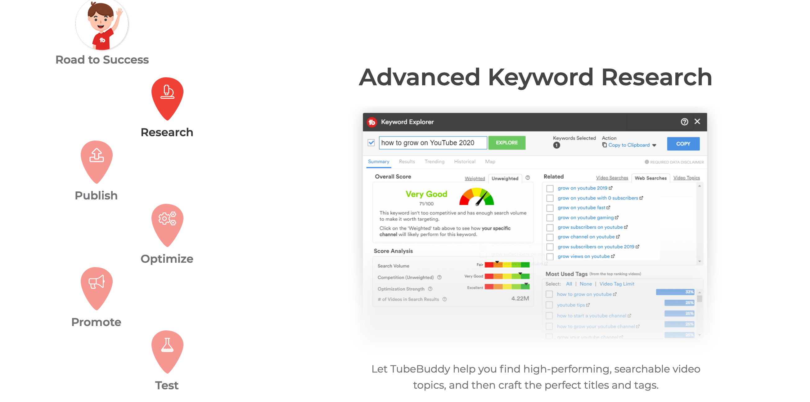 TubeBuddy is a browser extension that will then let you run a test on your chosen keywords, to see it’s score, a competitor analysis, optimization strength, and other related keywords.